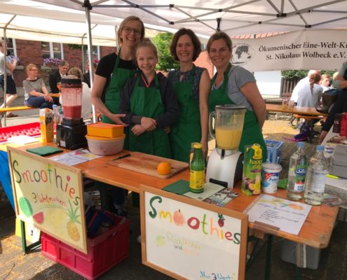 “Vier gewinnt” war der meistverkaufte Smoothie am Stand des ÖWK beim Pfarrfest der St. Nikolaus Gemeinde an Fronleichnam. Auf dem Markt der Möglichkeiten erläuterte der Vorstandsvorsitzende des ÖWK, Christoph Roer, dass der ÖWK aus einem an den Verein gespendeten Euro, durch die Unterstützung des BMZ, vier Euro für seine Projekte in Nepal und Nigeria macht. Neben Schmuck und Artikeln aus dem Eine-Welt-Laden waren es bei schönem Wetter vor allem die köstlichen Smoothies, die bei den zahlreichen Besuchern begehrt waren. Viele nutzten auch im Schatten der Bäume die Gelegenheit sich im 4 Gewinnt zu messen.